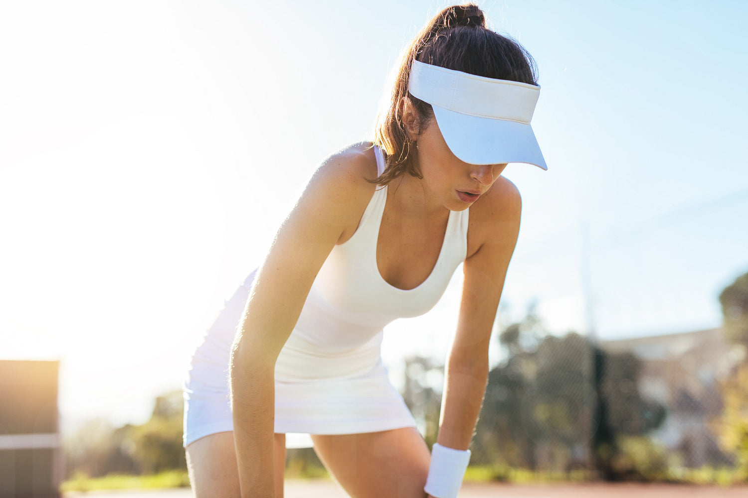 Sports woman bending over and taking a breathe. Female tennis player taking at break during the match.