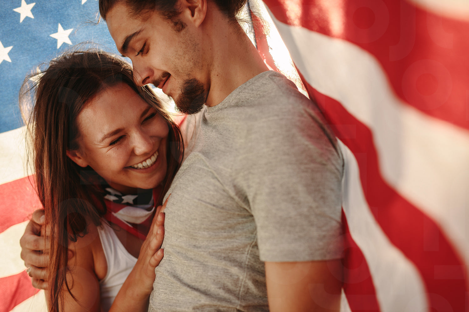 Couple in love with American flag around. Happy young man and woman under USA national flag.