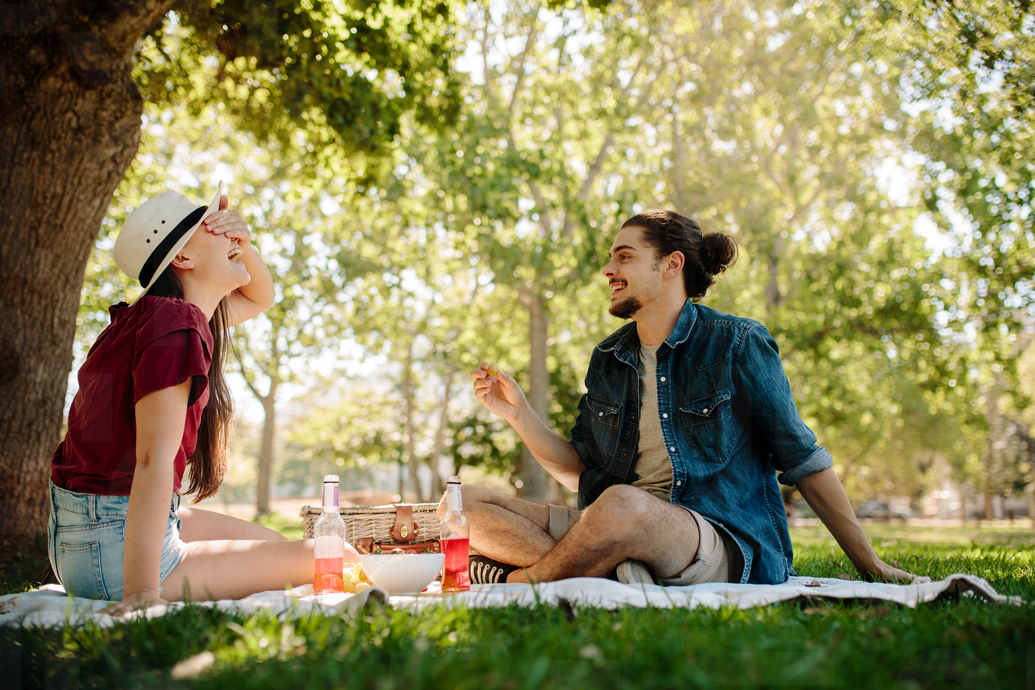 Couple playing a game on picnic at park. Woman covering her eyes with man holding a fruit in hand.
