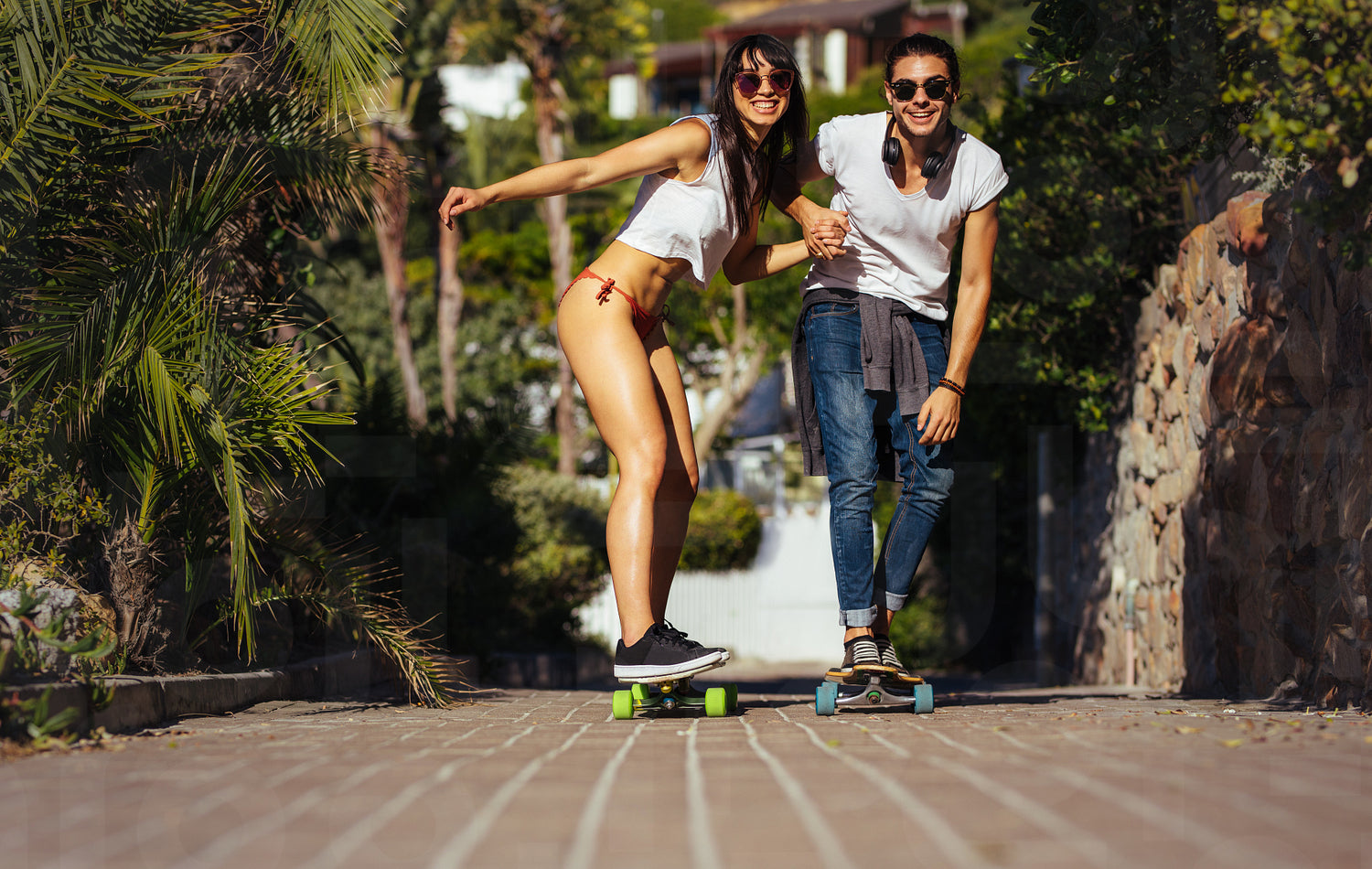 Happy couple riding on skateboards on walkway. Man and woman in summer clothes skating together on vacation.