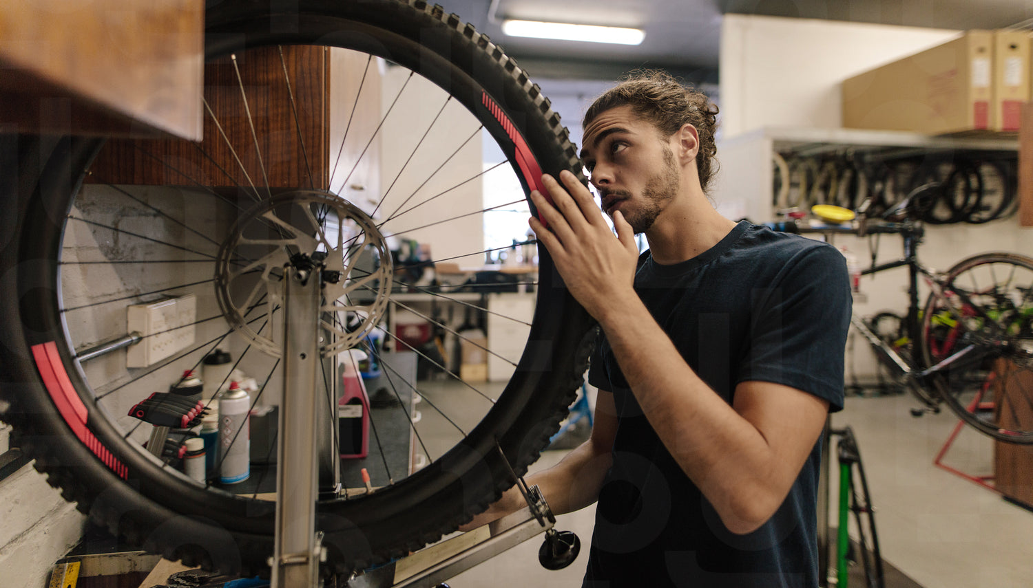 Man working on a bicycle wheel in a repair shop. Worker fixing a bicycle in workshop.