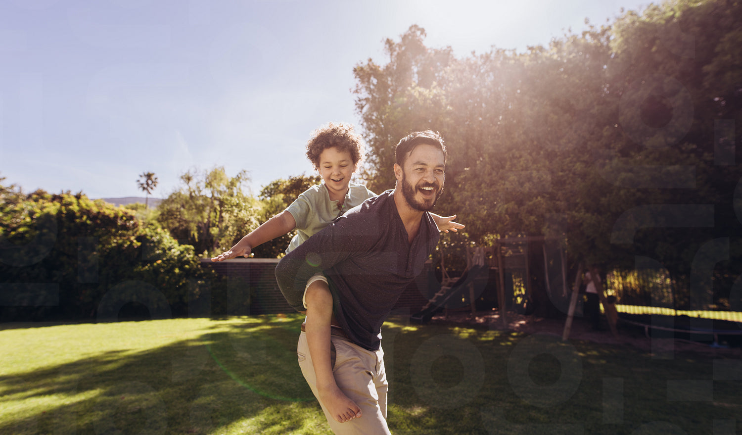 Cheerful kid enjoying a ride on the back of his father with arms open. Father walking in park carrying his son on his back on a sunny day.