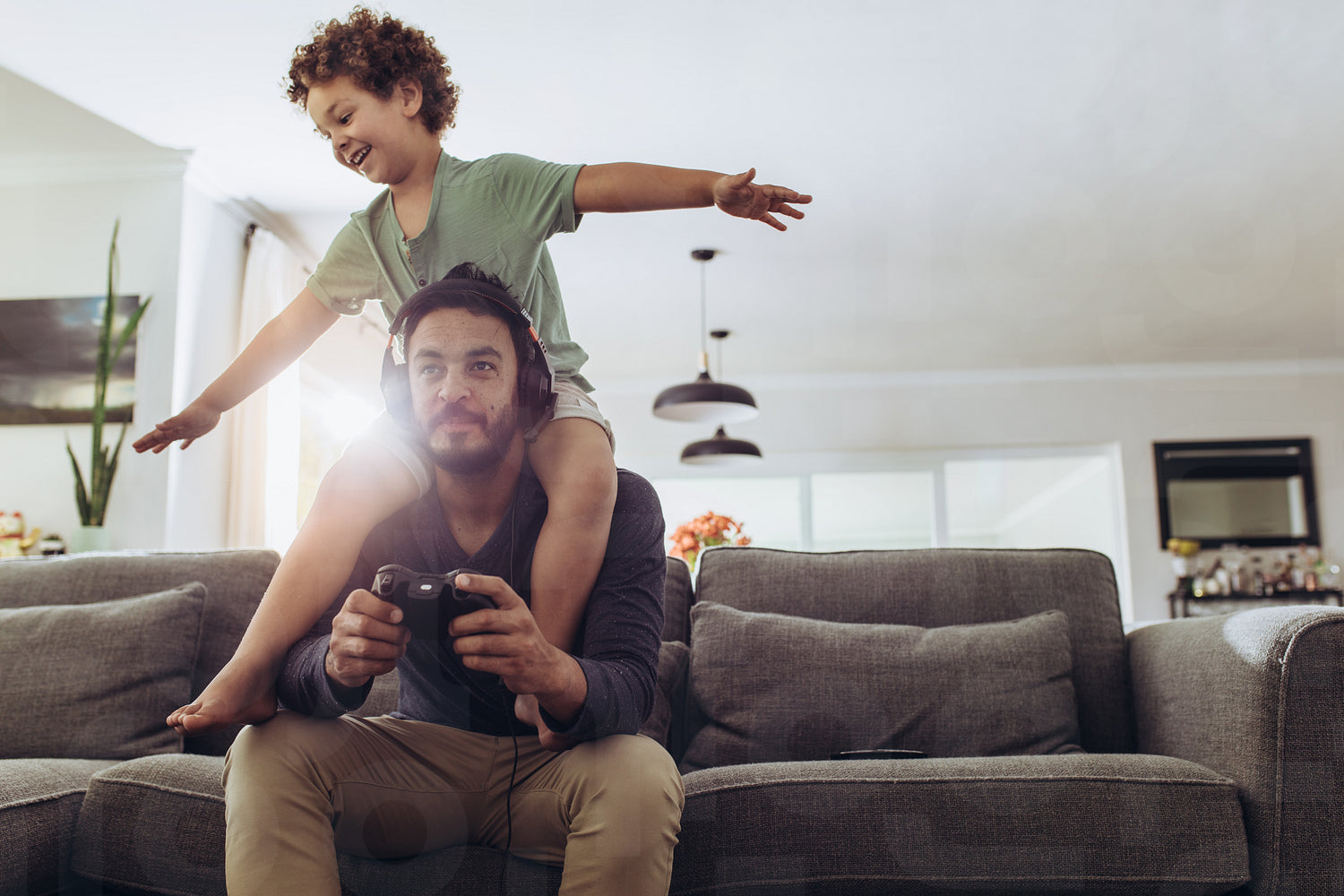 Man playing video game sitting on couch at home with his son sitting on his shoulders. Father and son having fun at home playing video game.
