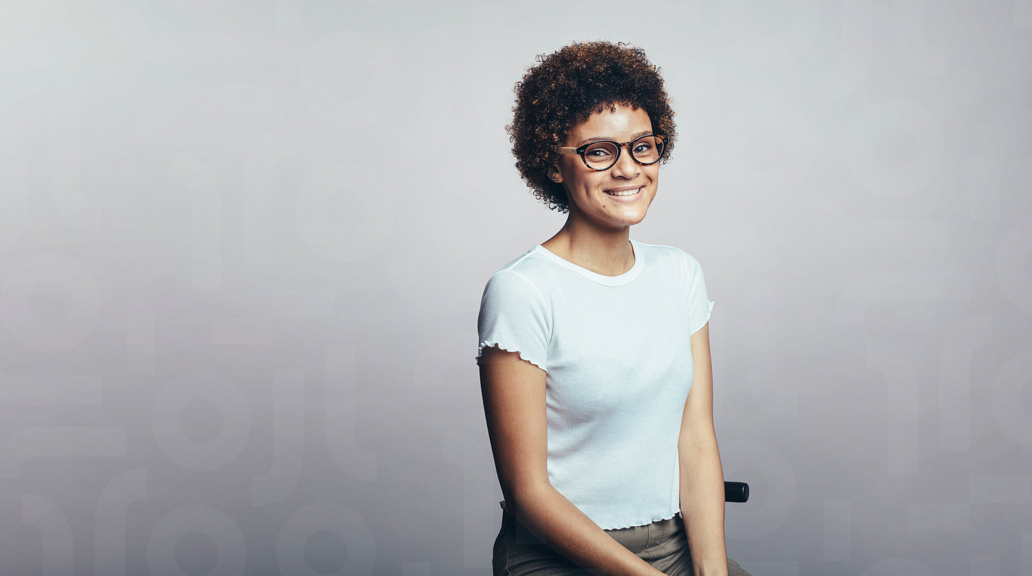 Portrait of a smiling young woman wearing eyeglasses isolated on grey background. Smiling businesswoman with curly hair looking at camera.