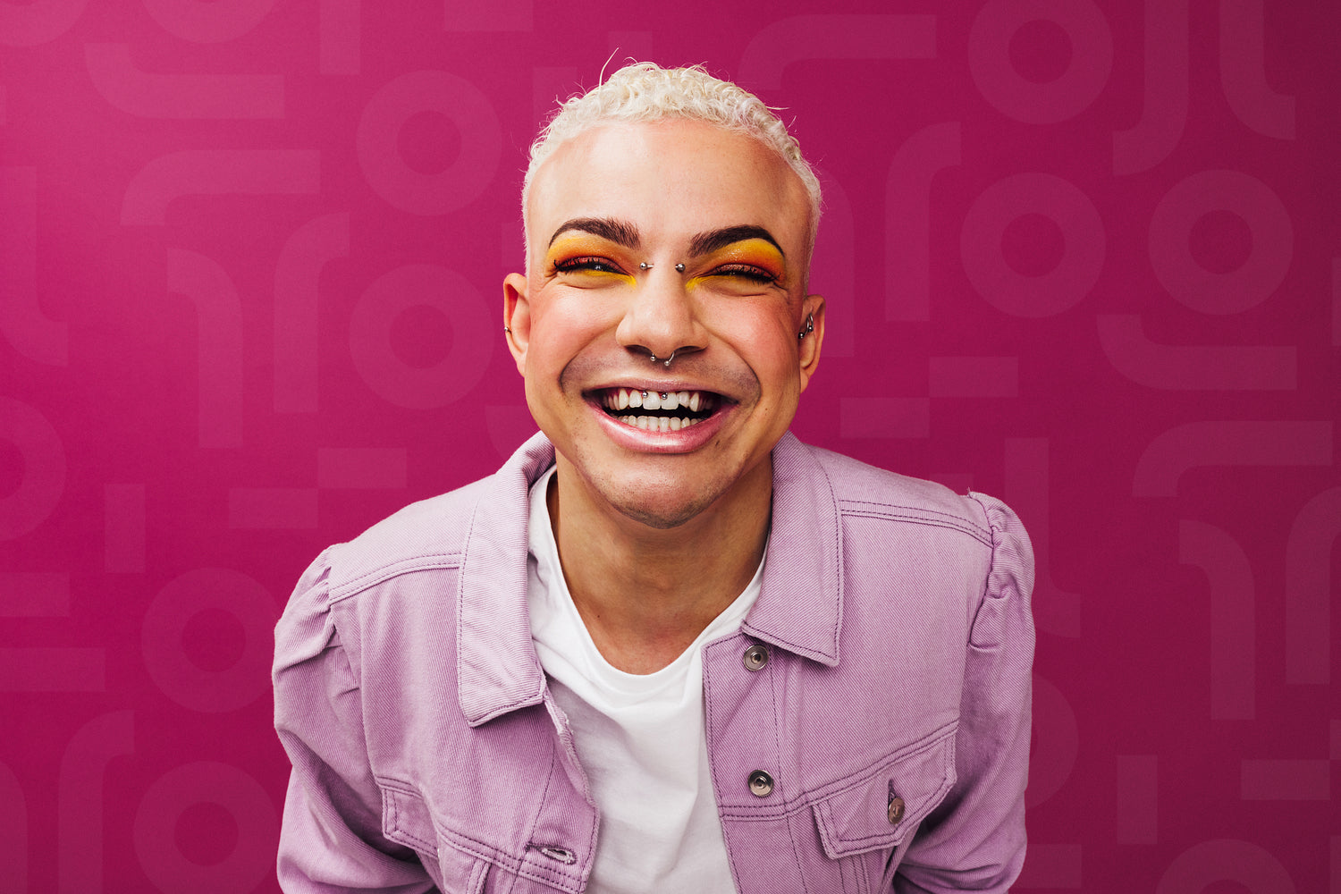 Confident queer man smiling at the camera while standing alone in a studio. Non-conforming young man wearing colourful eye shadow and jewellery against a purple background.