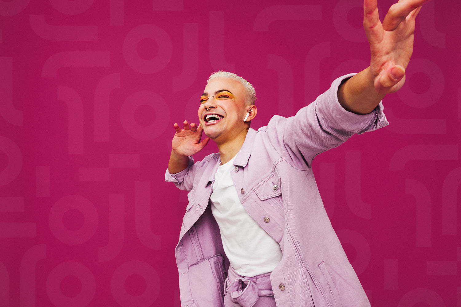 Hipster enjoying his favourite music. Non-conforming queer man dancing cheerfully while listening to music on wireless earphones. Smiling young man standing alone against a purple background.