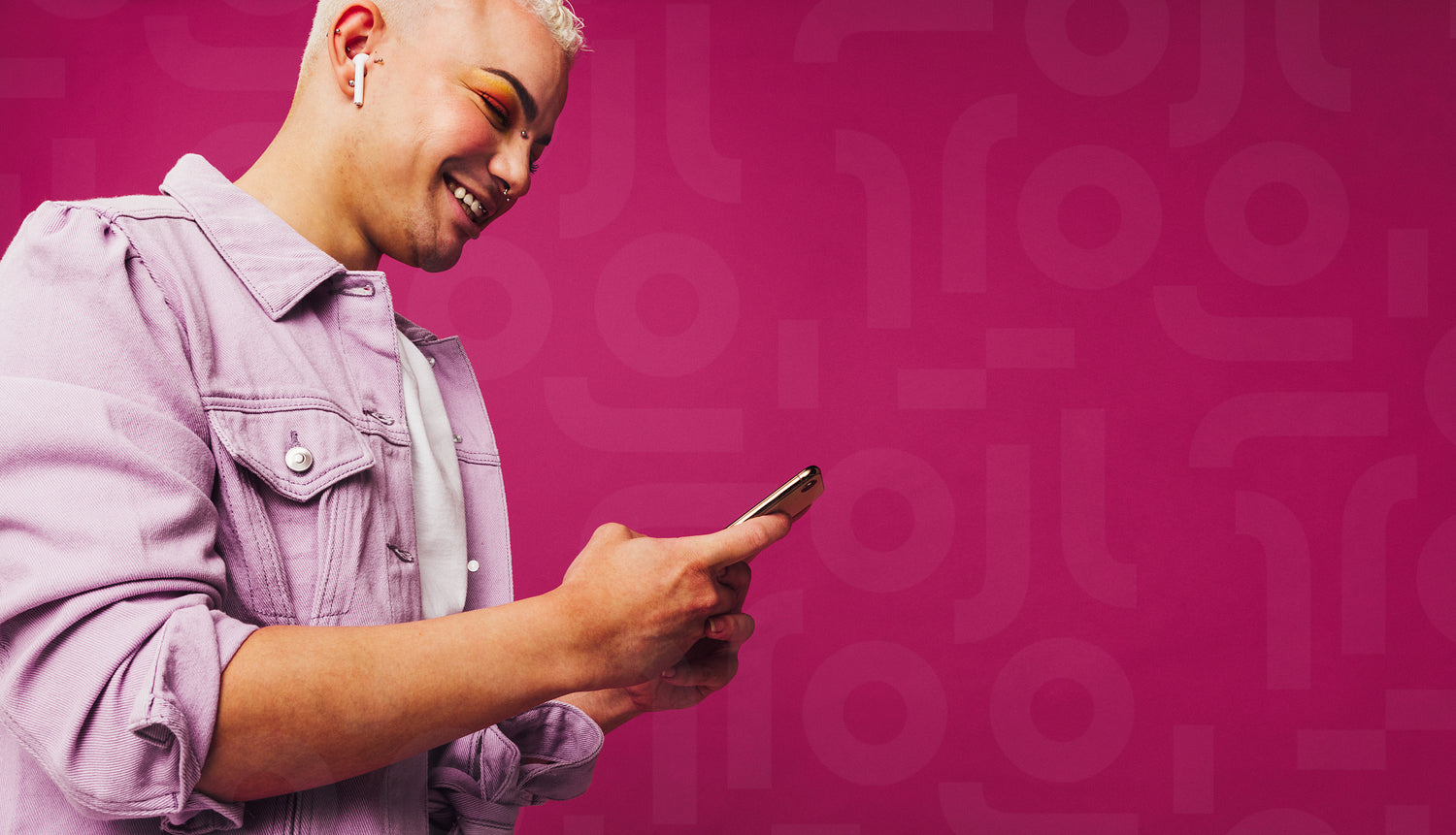 Non-conforming young man playing his favourite music. Happy young man using a smartphone while wearing wireless earphones in a studio. Queer man smiling cheerfully against a purple background.