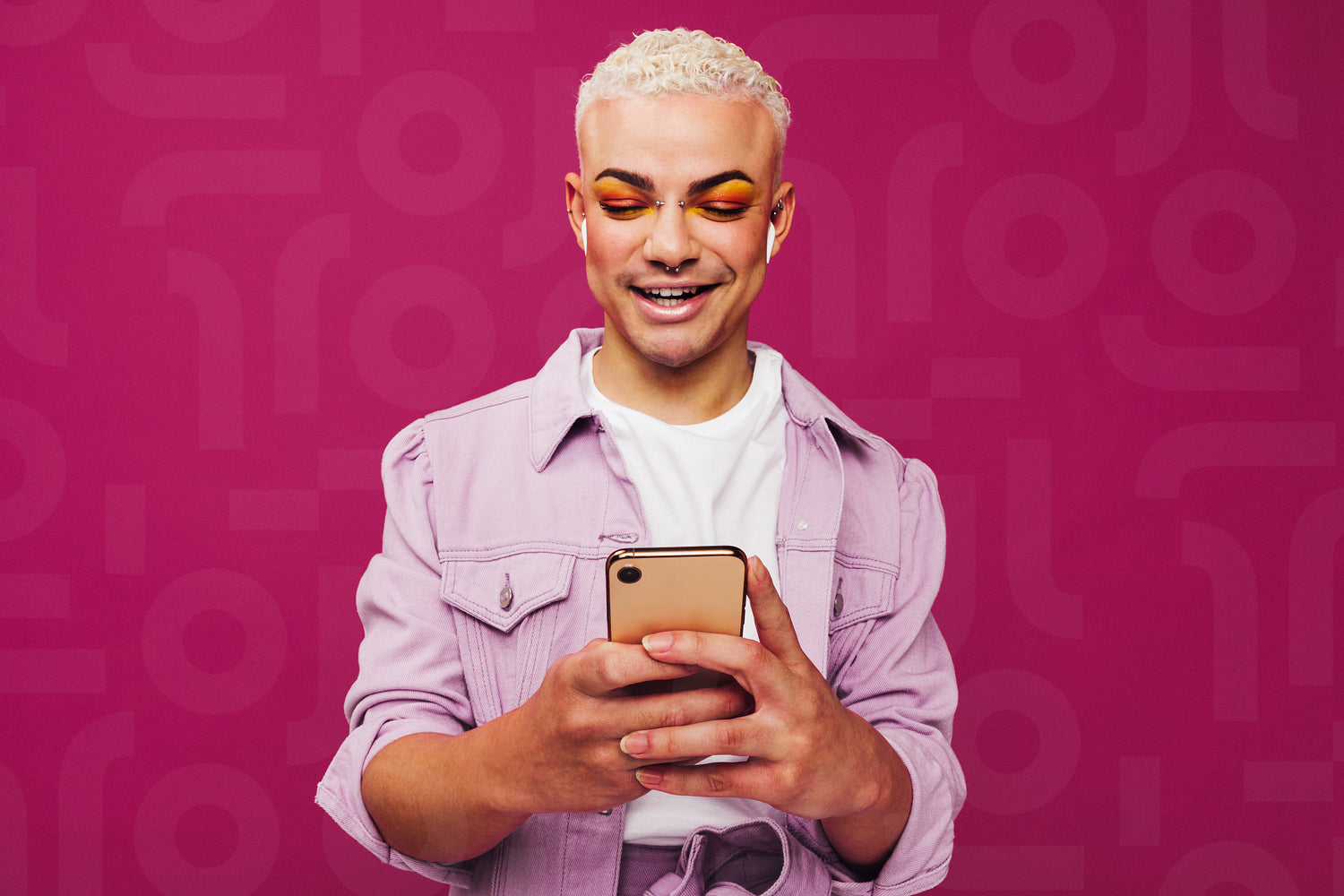 Queer man playing his favourite playlist. Happy young man using a smartphone while wearing wireless earphones in a studio. Non-conforming queer man smiling cheerfully against a purple background.
