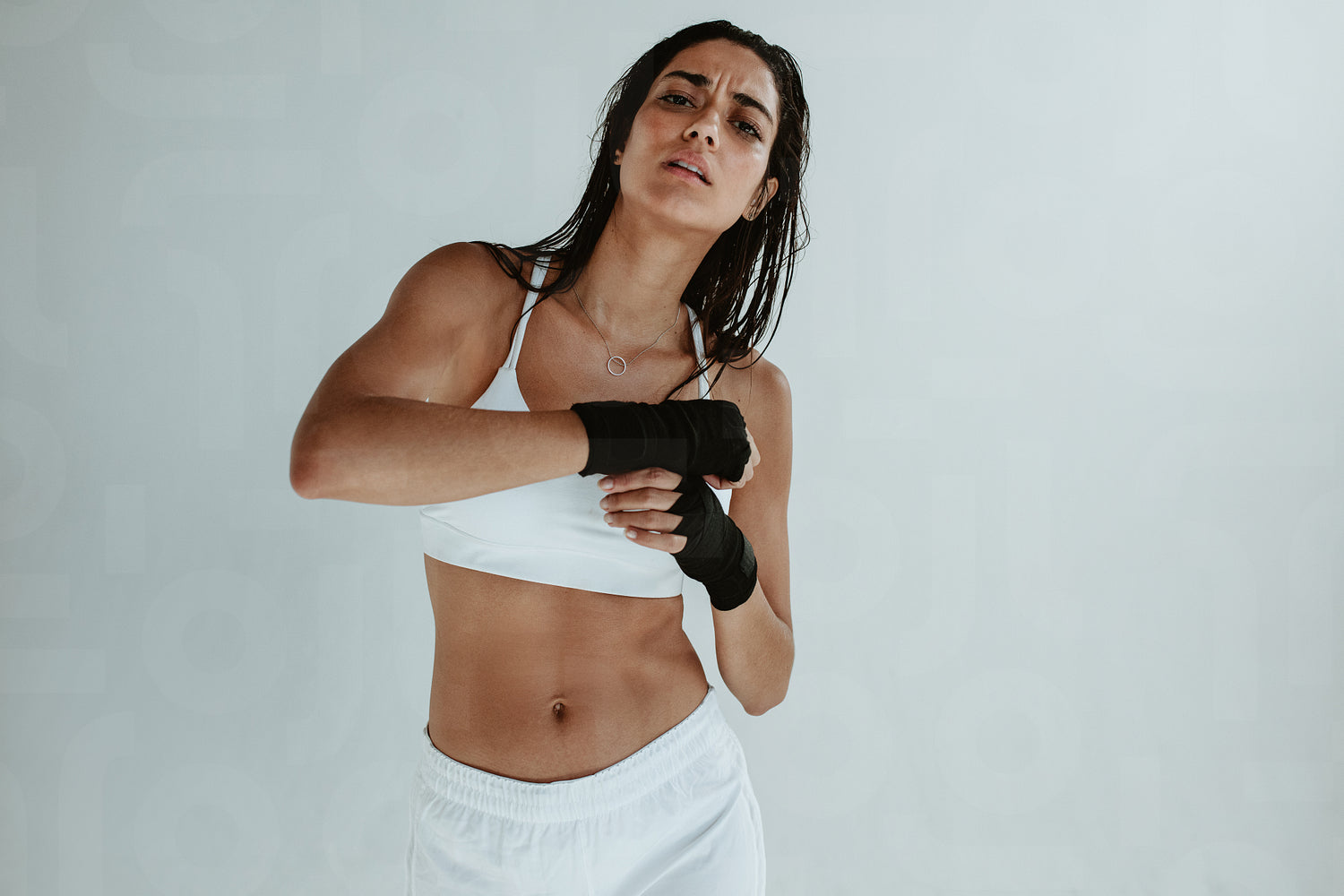 Female boxer wearing strap on wrist. Fitness young woman with muscular body preparing for boxing training against white background.