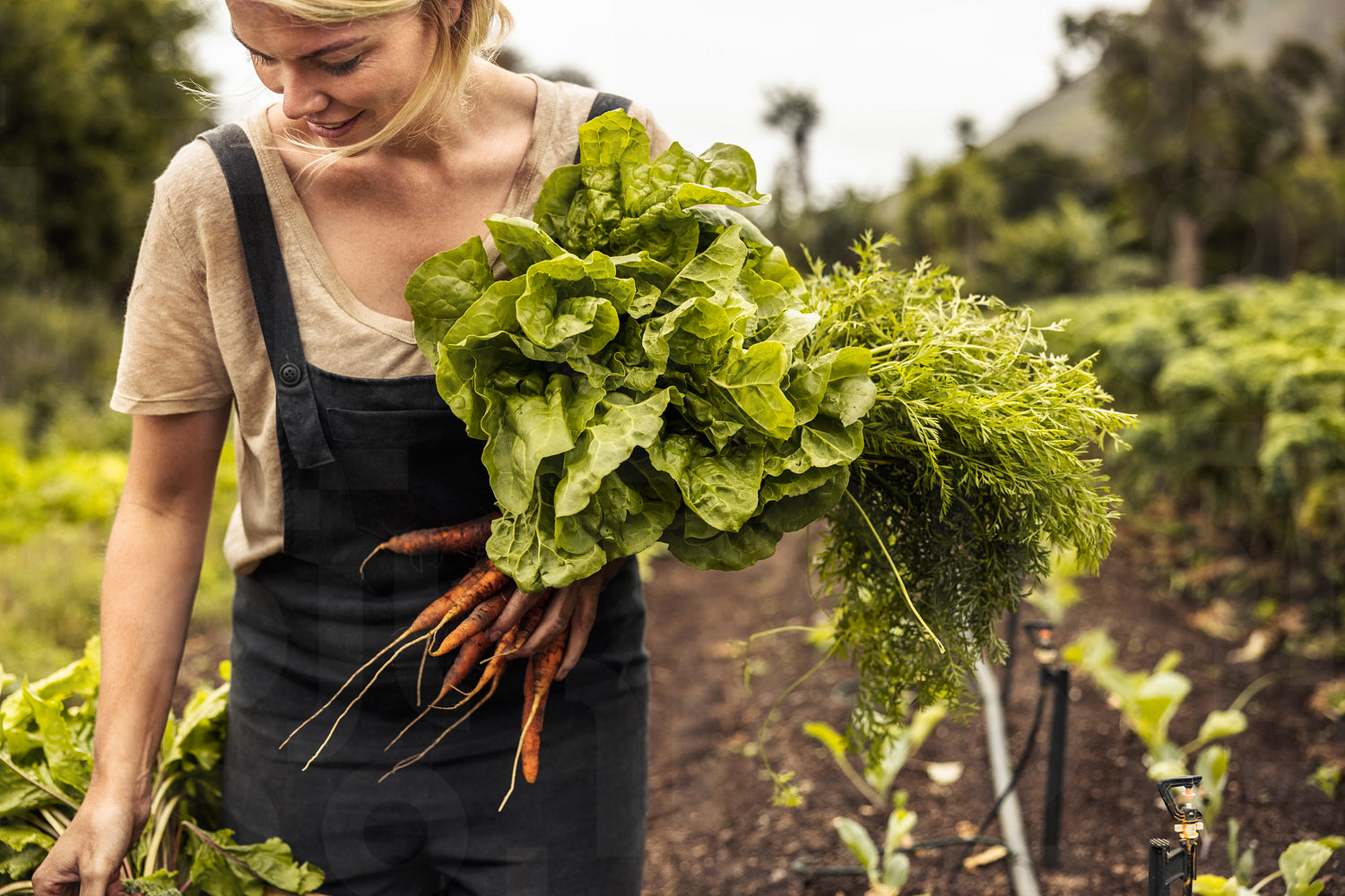 Smiling organic farmer holding freshly picked vegetables on her farm