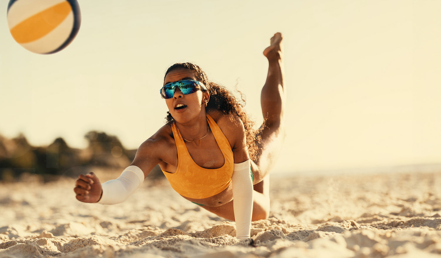Brazilian beach volleyball player dives in mid-air on a sunny day, showcasing dynamic skills in a championship tournament. Her powerful jump and dig on the sandy court illustrate her expertise as a pro sportswoman.