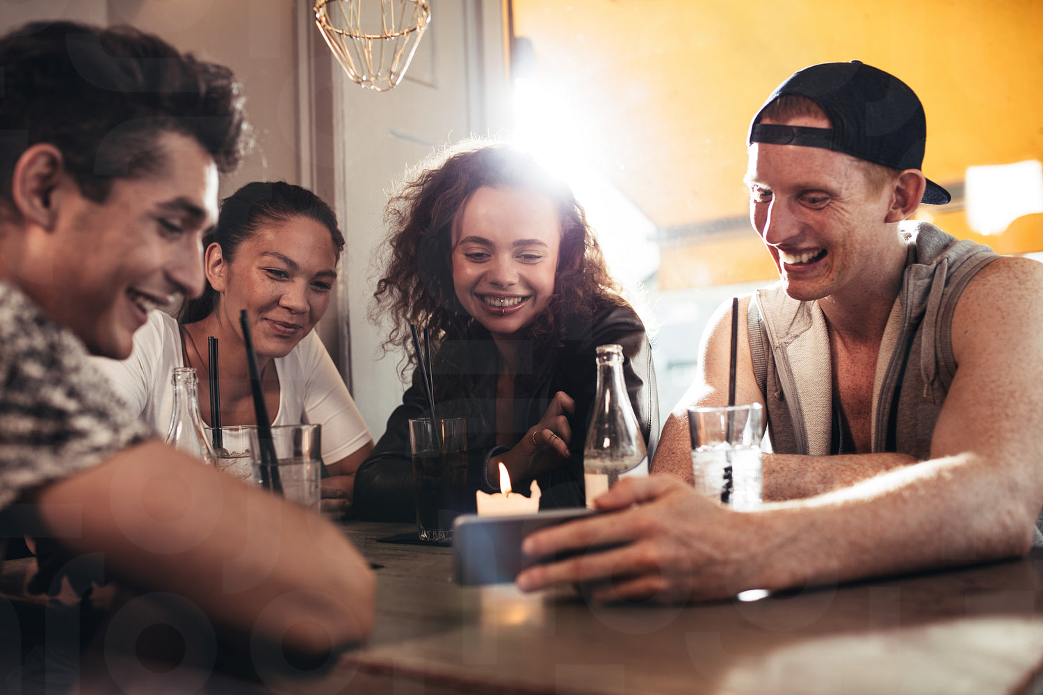 Cheerful young friends looking at smart phone while sitting in cafe. Mixed race people sitting at a table in restaurant using mobile phone.
