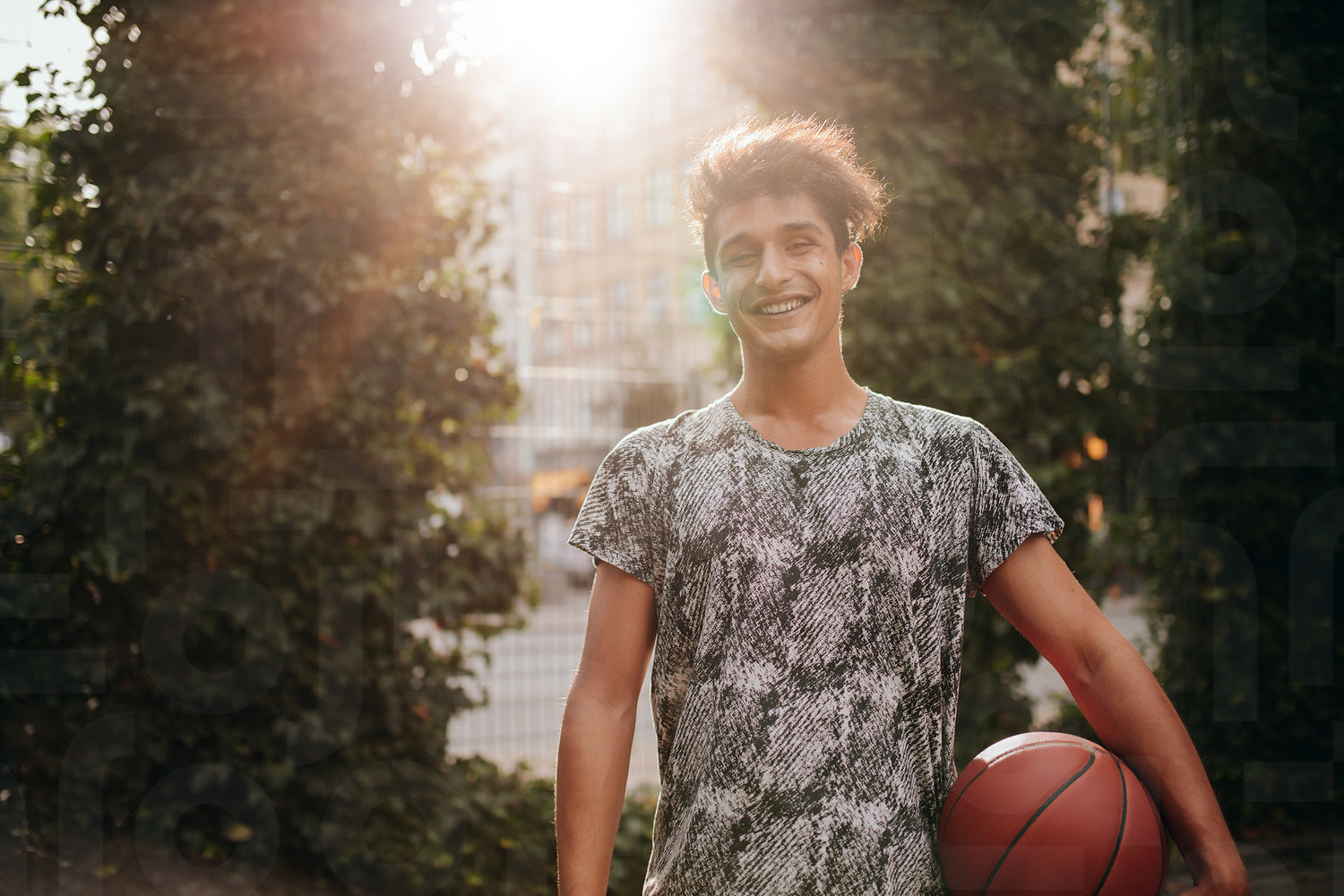 Portrait of handsome young basketball player holding a ball on outdoor court. Smiling teenage streetball player looking at camera.