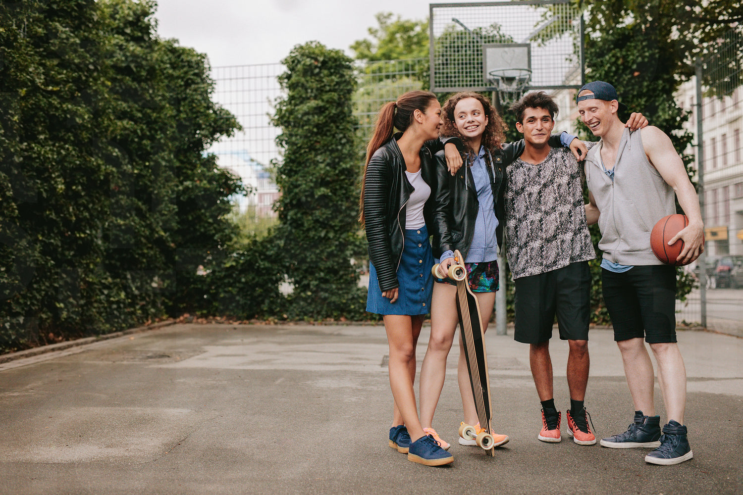 Full length portrait of teenage friends standing together with skateboard and basketball. Mixed race group of people enjoying outdoors.
