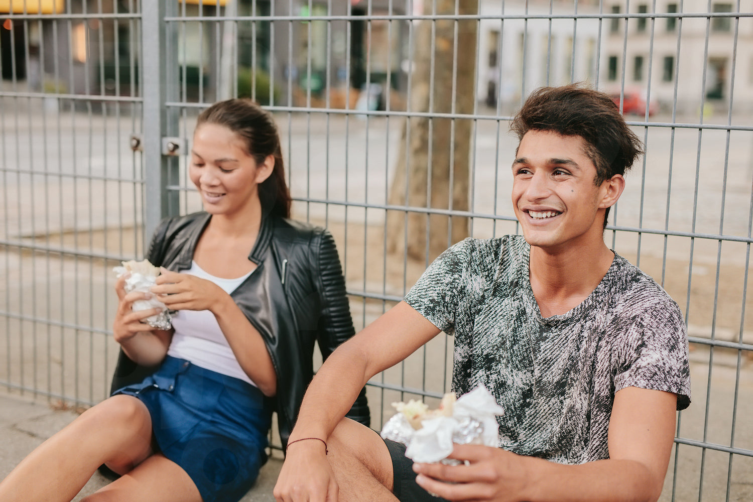 Young man and woman sitting outdoors and smiling. Teenagers relaxing outdoors and eating.