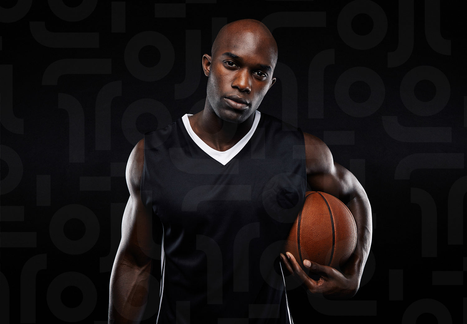 Portrait of confident young man with strong build holding a basket ball against black background. African male athlete looking at camera. Muscular basketball player.