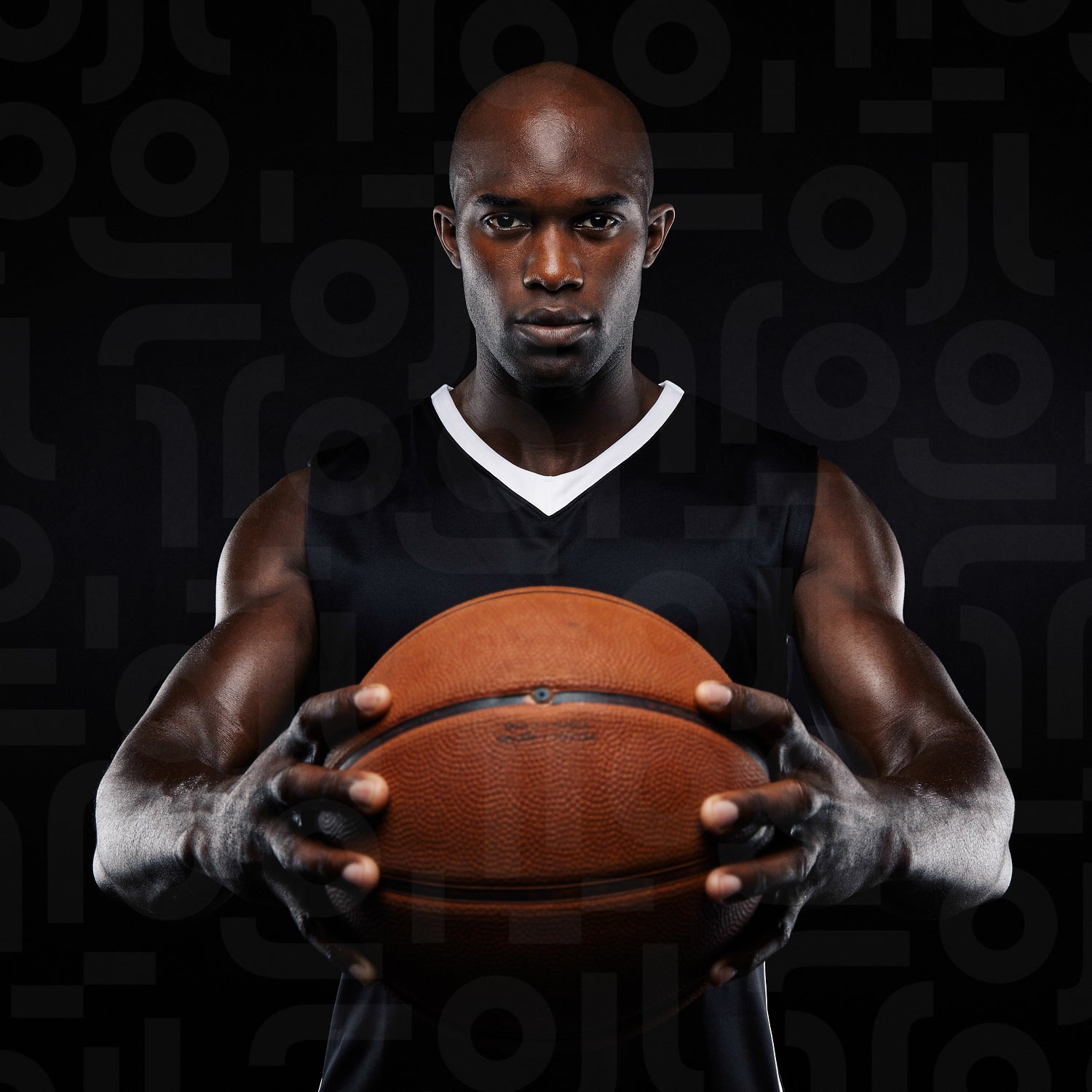 Portrait of muscular young male basketball player with a basketball posing on black background. Afro american male athlete with basketball.