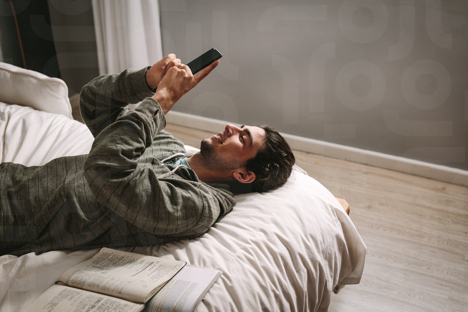 Student using mobile phone lying on bed with books by his side. Student taking a break from studies and checking his mobile phone.