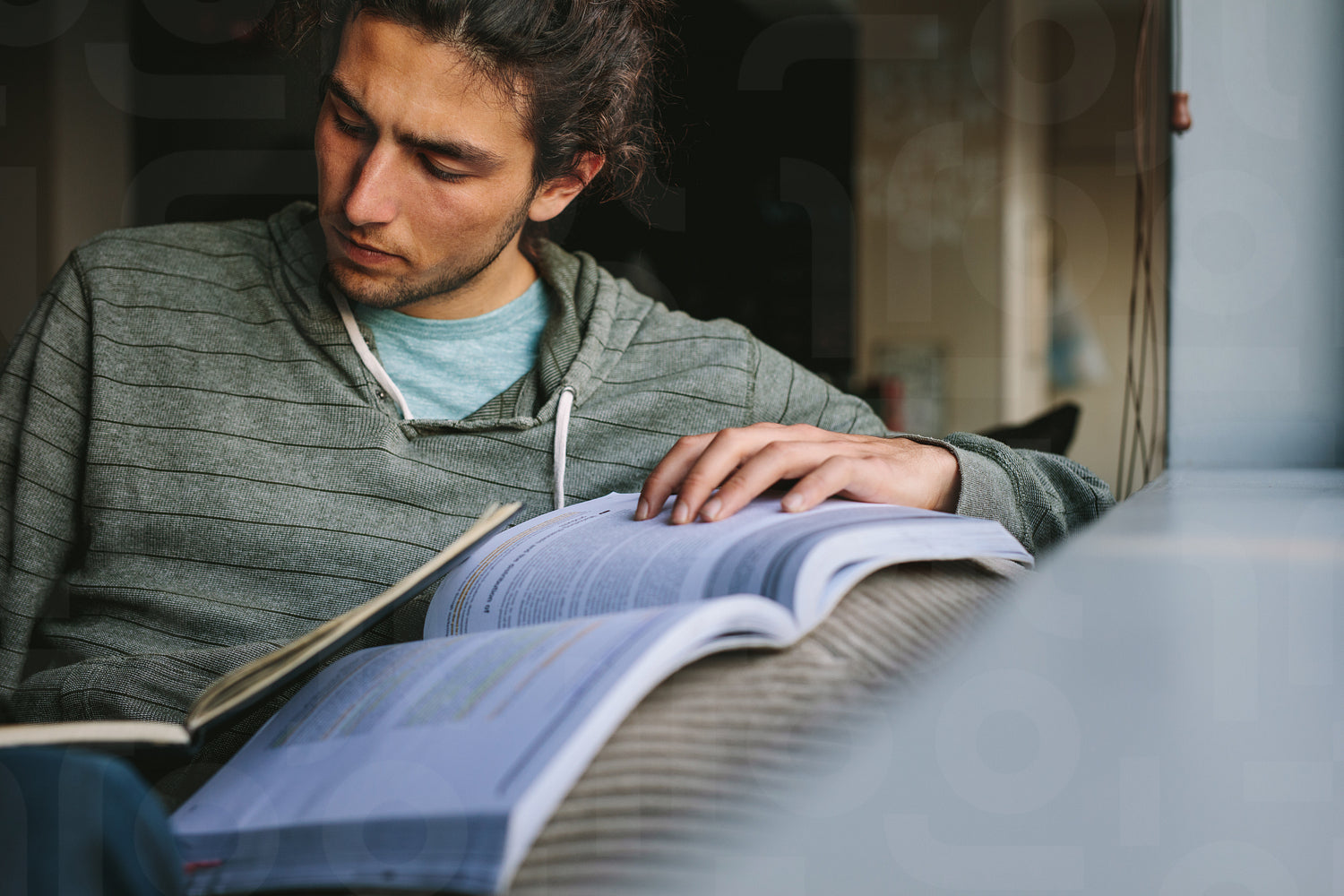 Student making notes from a reference book sitting on a couch. Young man studying seriously sitting at home.