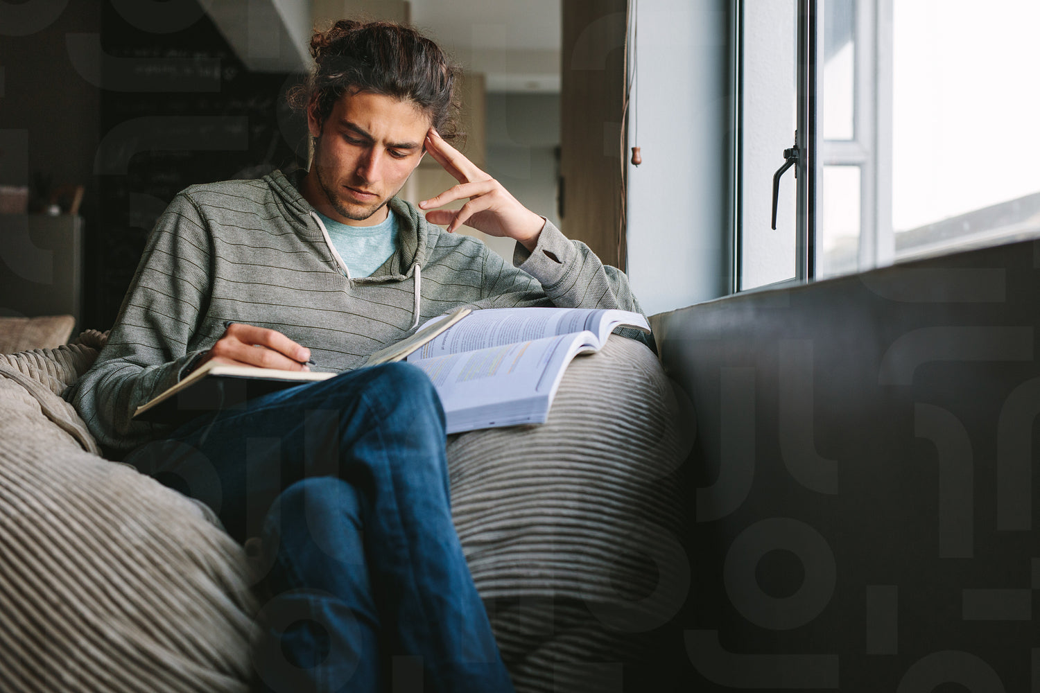 Student sitting at home looking tensed studying seriously. Man sitting on couch beside a window writing in a book.