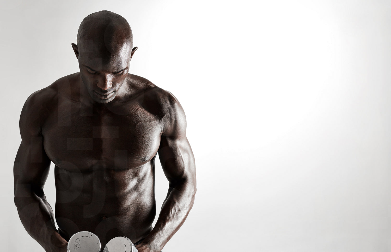 Shot of african bodybuilder holding dumbbells against grey background with copy space. Young man exercising with hand weights.