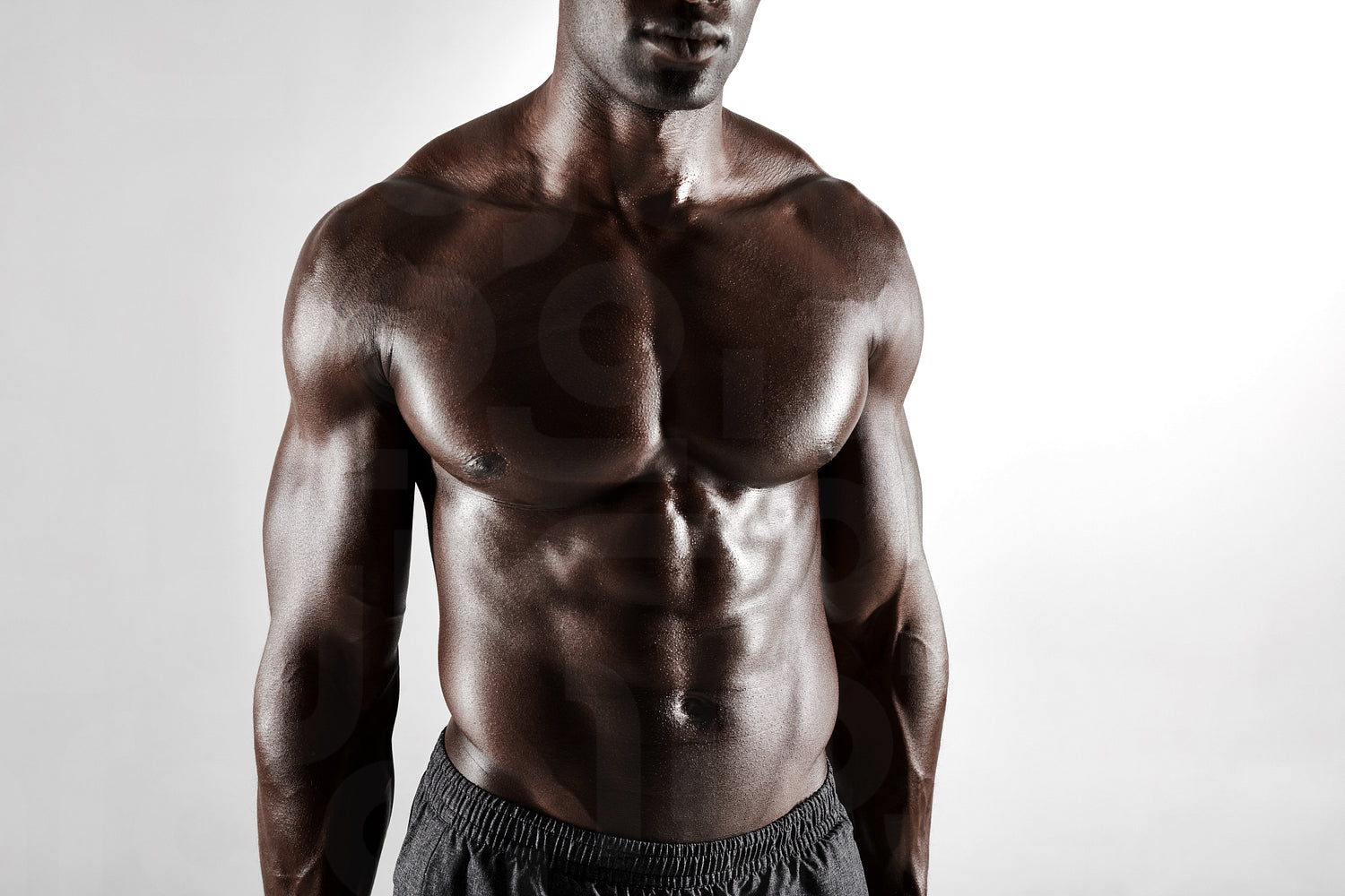 Close up of shirtless african man with muscular abs standing against grey background. Cropped image of torso of a muscular man.