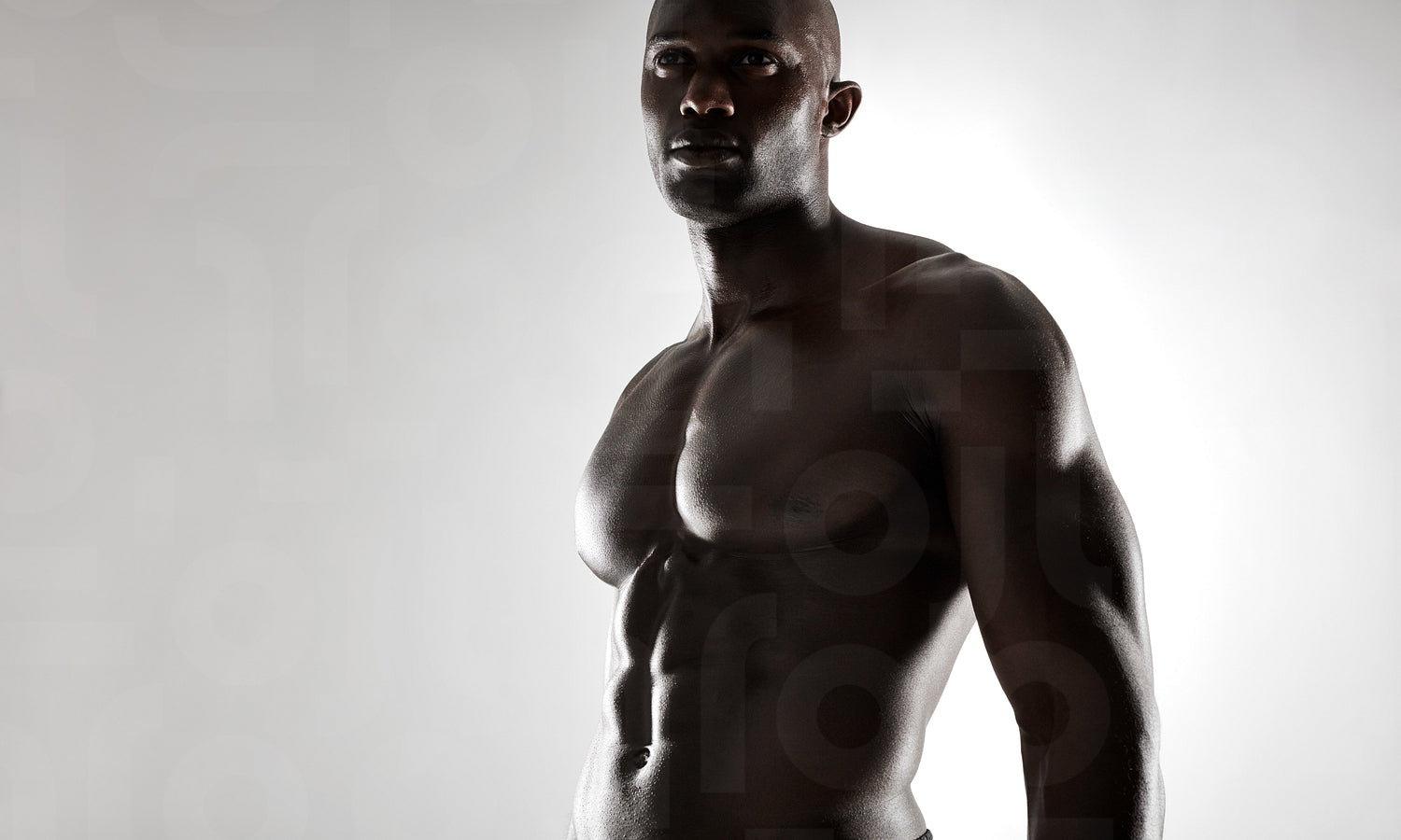 Studio shot of muscular man posing against grey background. Shirtless male african model with muscular build looking away.