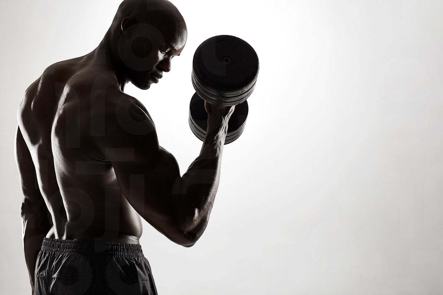 Silhouette of young african man exercising with heavy dumbbells against grey background. Healthy black male model working out with heavy weights.