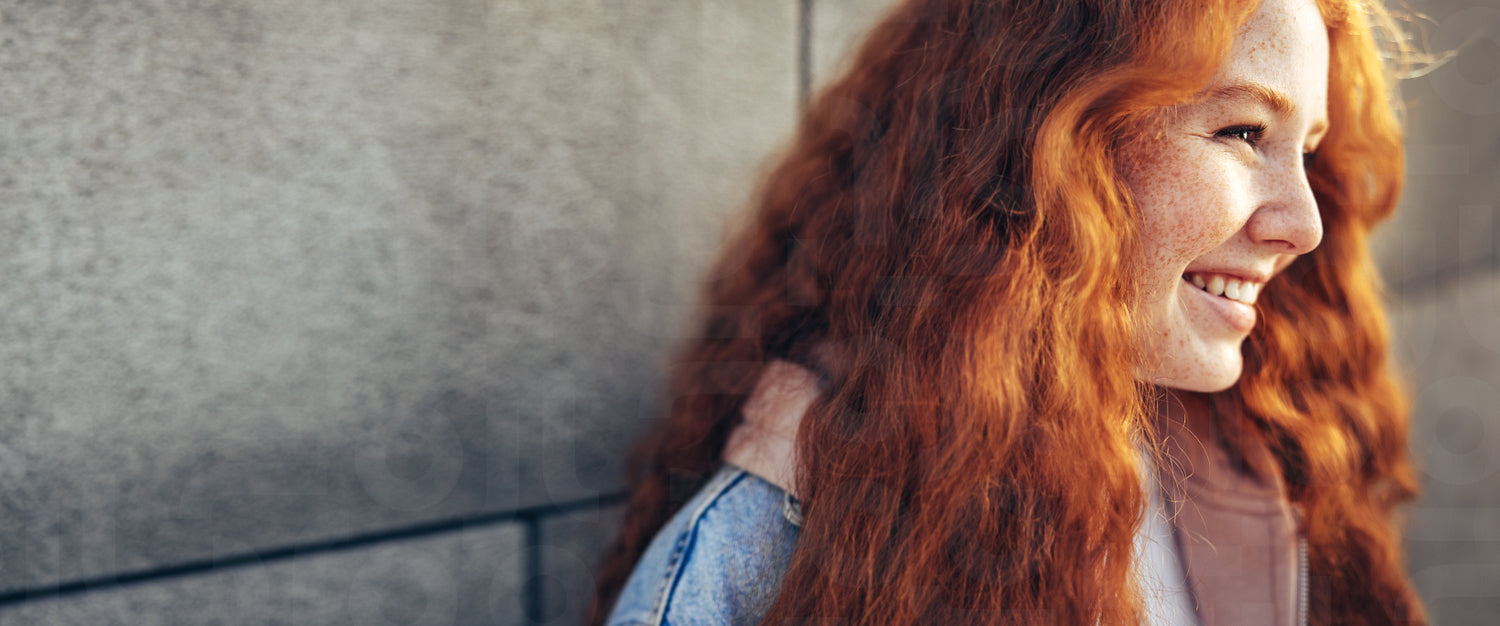 Closeup of a smiling girl standing against the wall. Young woman looking away and smiling.