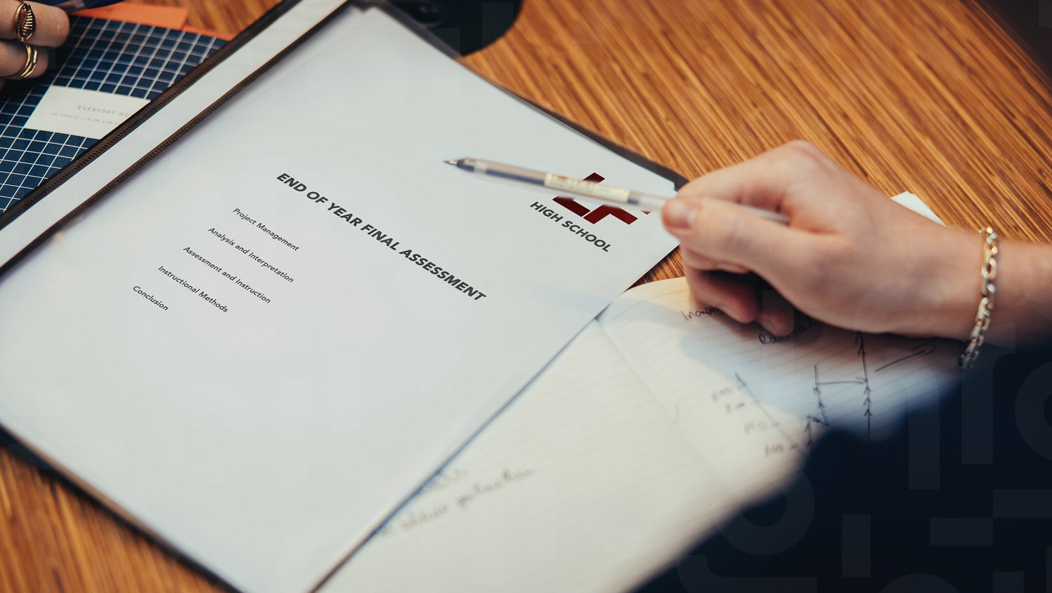 Close-up of a female hand holding project assessment file. Woman hand with project notes.