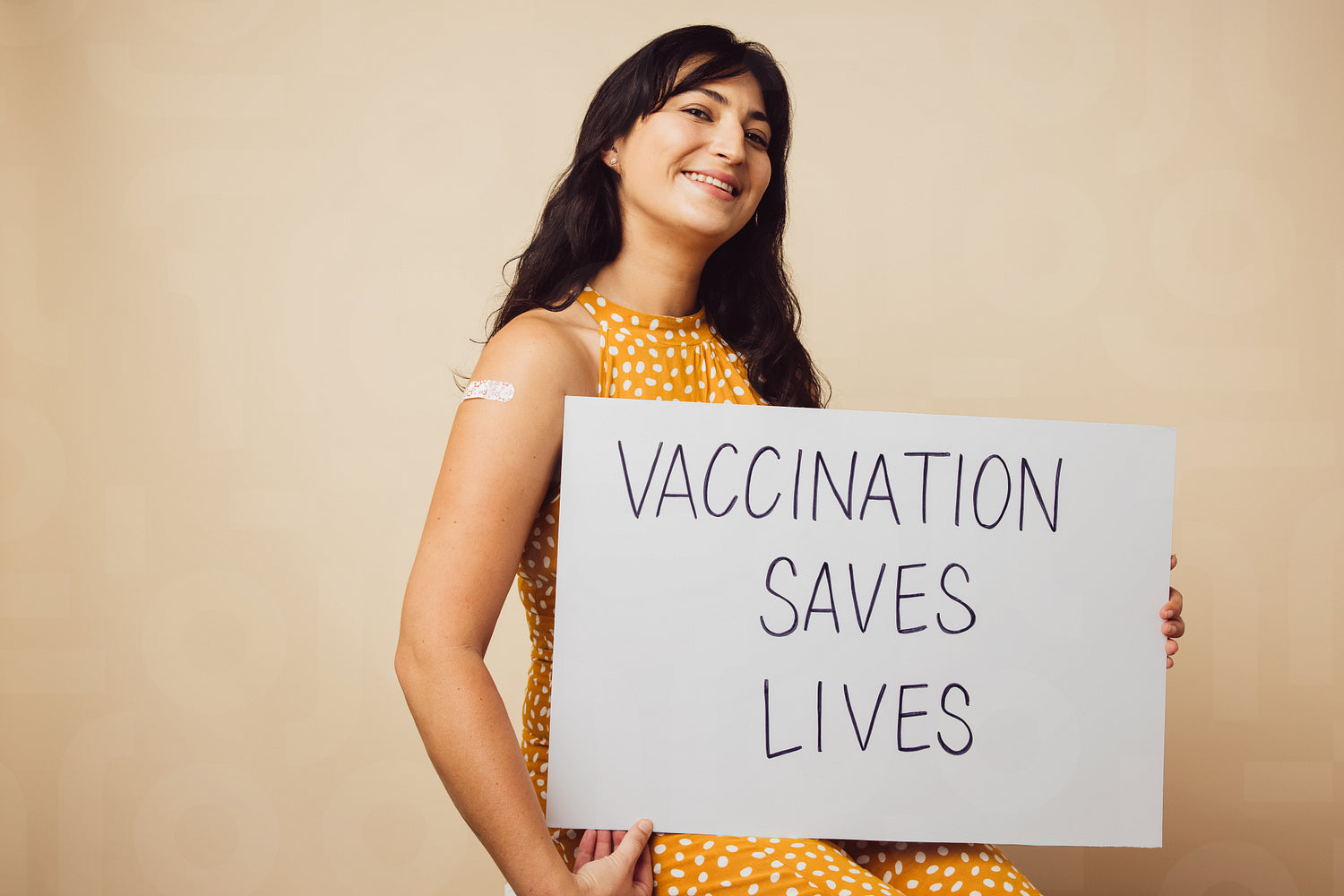 Beautiful woman holding a signboard with "vaccination saves lives" written on it. Female with bandage on her arm after getting vaccination holding a banner on brown background.