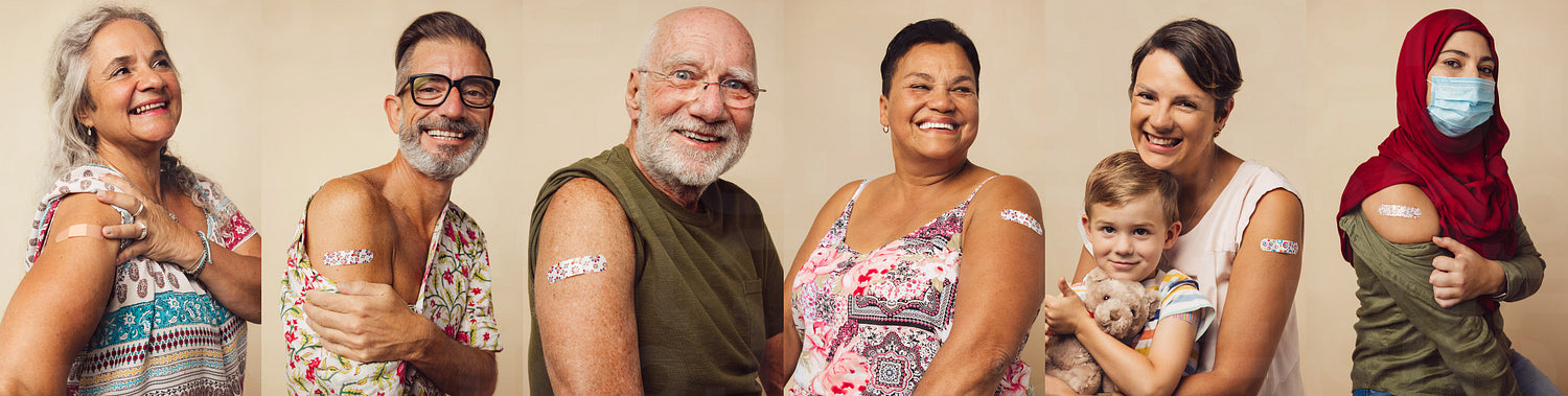 Collage of portraits of an ethnically diverse and mixed age group of people showing their shoulders with band-aids on after getting a vaccine. Composite image of a group of people after receiving corona virus vaccination.