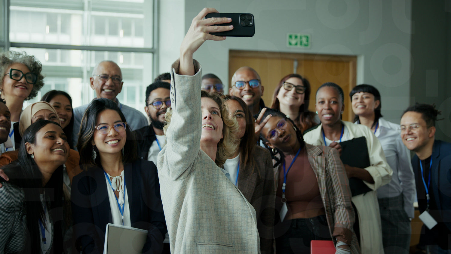Diverse business professionals happily take a group selfie together. They are smiling, laughing, and showing unity, success, and strong teamwork.