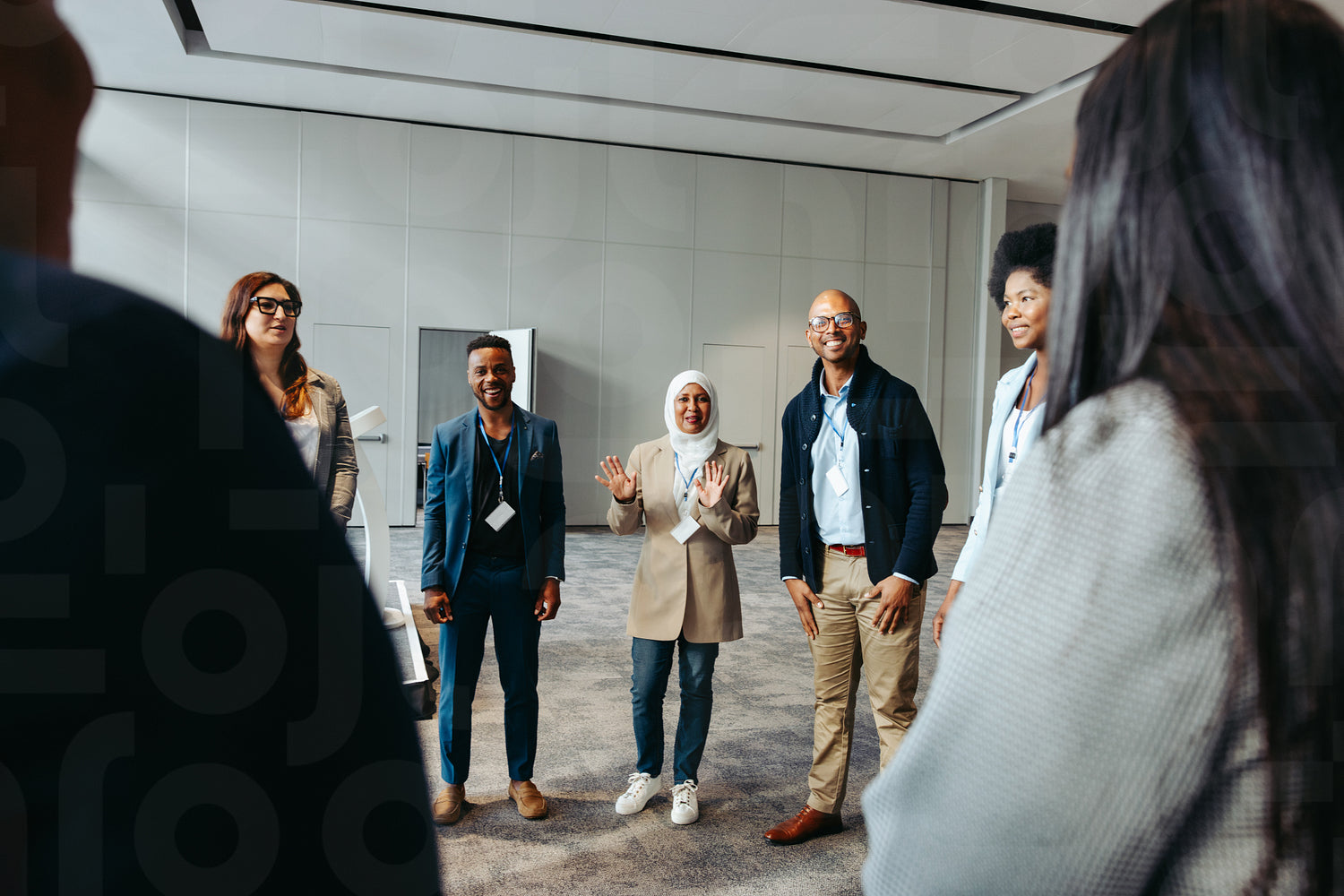 A diverse team talking and engaging in teambuilding activities in a modern office. Ideal for business and collaborative themes.