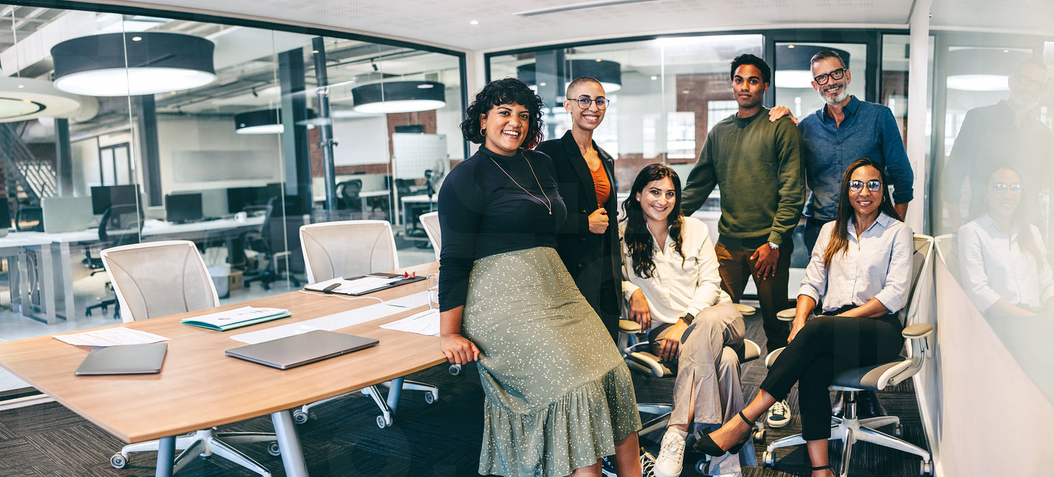 Team of businesspeople smiling at the camera in a boardroom. Cheerful businesspeople grouped together in a modern workplace. Diverse team of businesspeople looking cheerful.