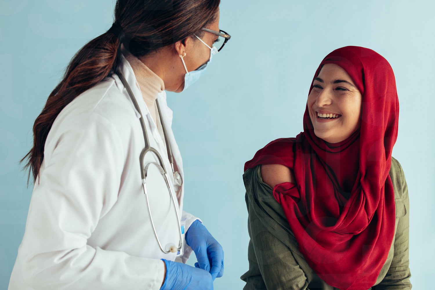 Smiling woman in hijab talking with female doctor in face mask. Woman getting vaccination from healthcare professional.