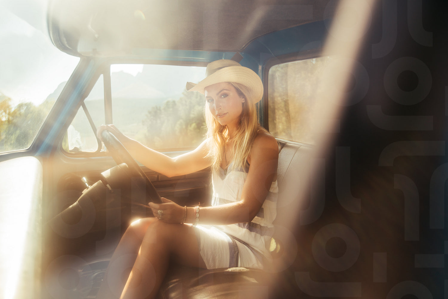 Portrait of an attractive young woman wearing a hat driving a car on sunny day