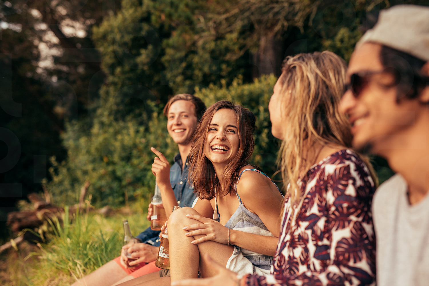 Portrait of cheerful young friends hanging out with beers. Group of friends sitting outdoors and having fun.