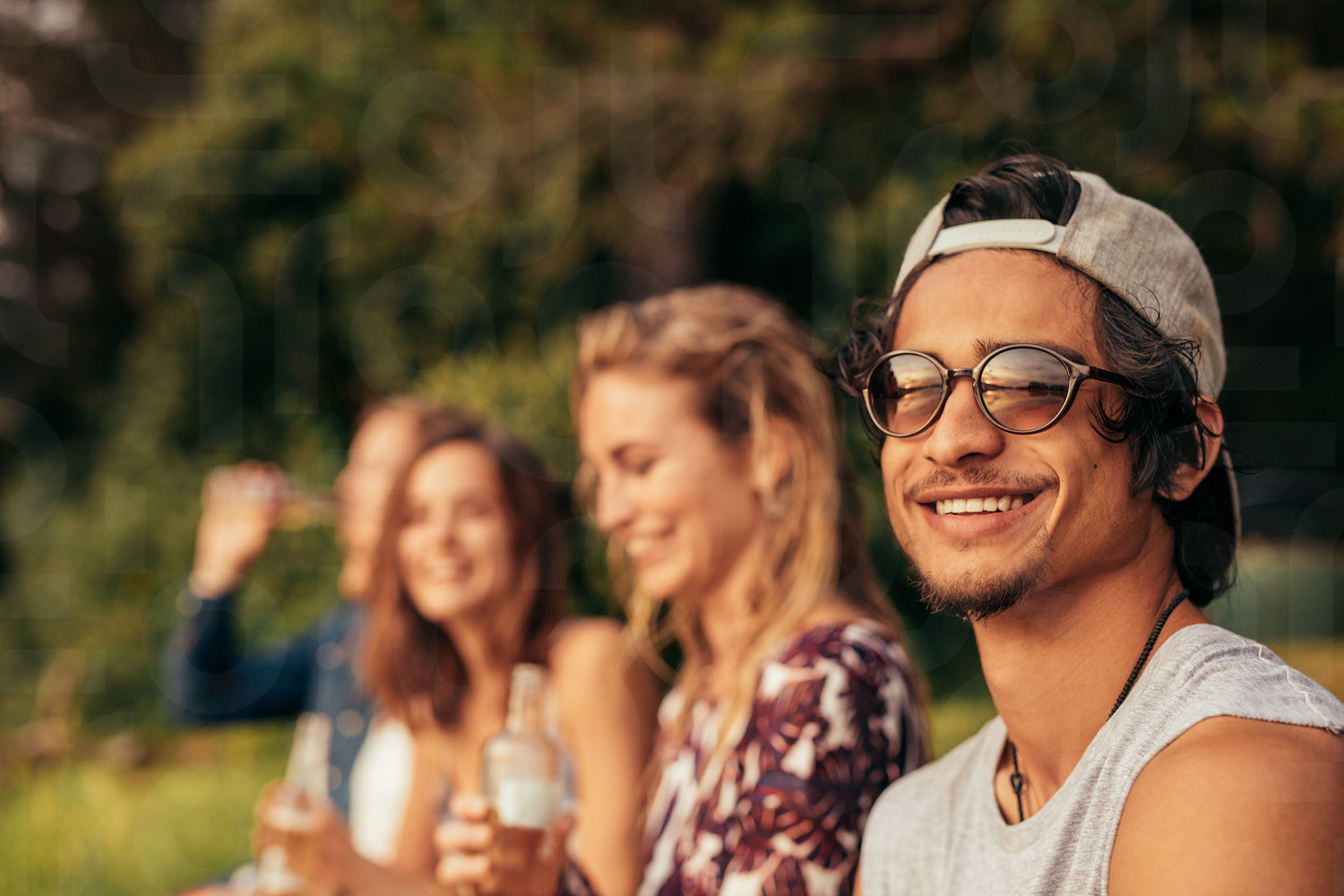 Portrait of happy young man at a lake with friends sitting by. Young friends hanging out at the lake.