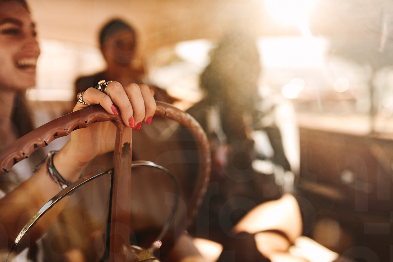 Hand of female on steering wheel of a car while driving. Young woman driving car with her friends sitting in the backseat.