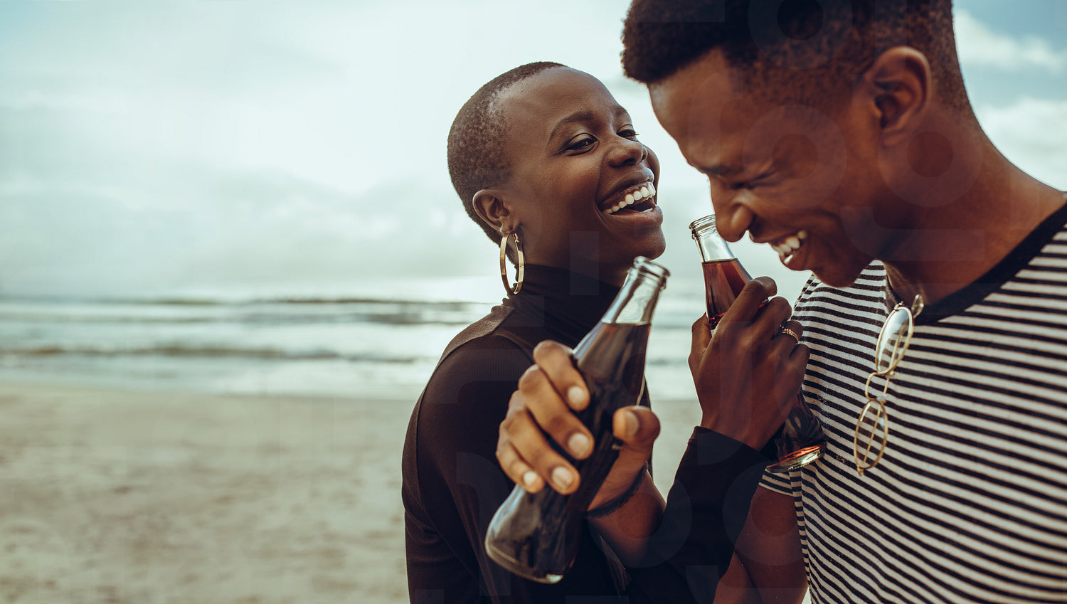 Beautiful couple at the beach with cola bottles. Cheerful young man and woman standing at the beach with soft drinks.