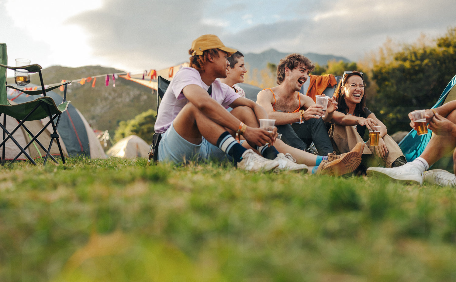 Friends gather together at a summer festival, sharing laughter, enjoying beers, and making joyful memories