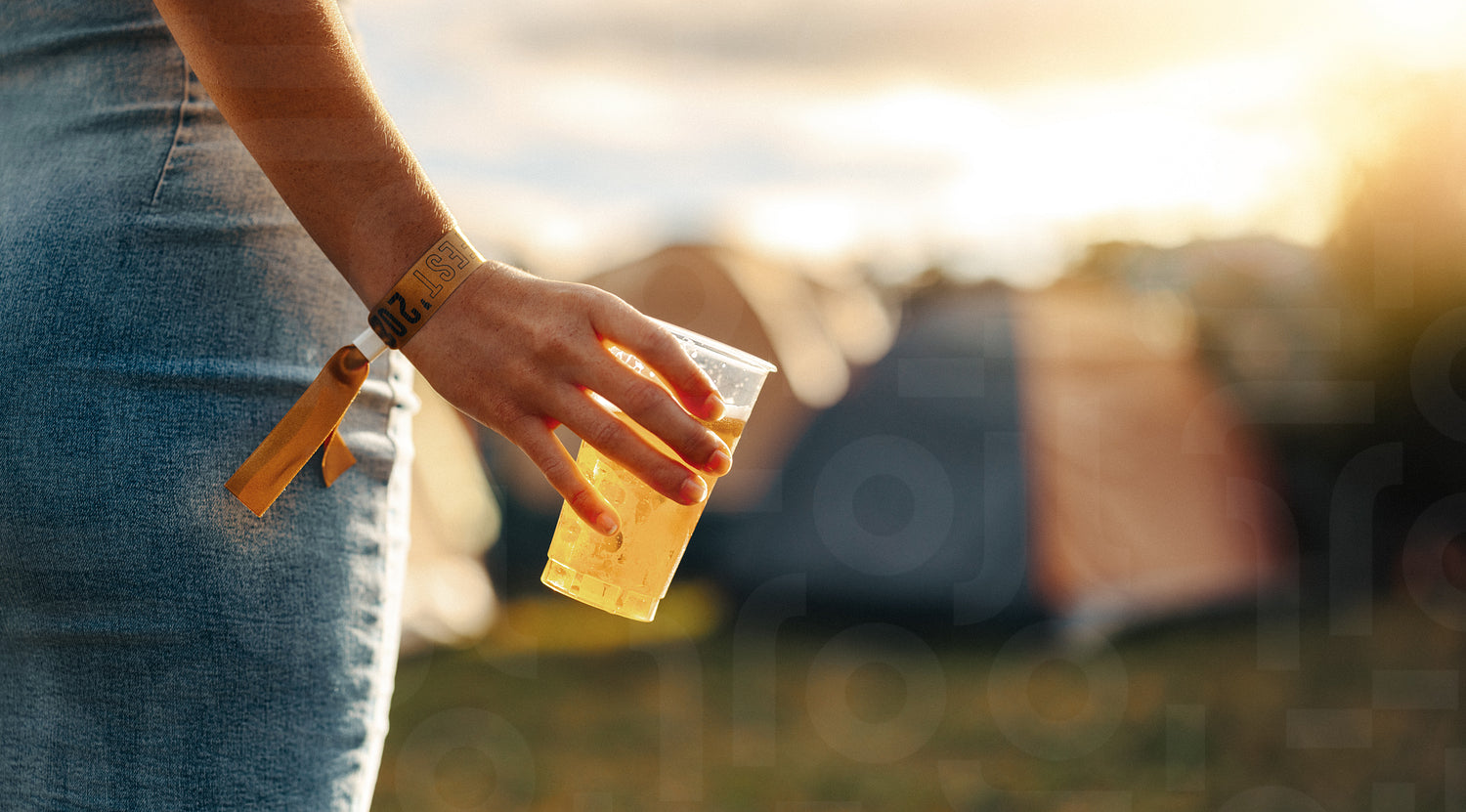 Rearview of an unrecognisable woman celebrating summer with a glass of beer, standing in the foreground of an eventful festival campground at sunset. This photo has intentional use of 35mm film grain.