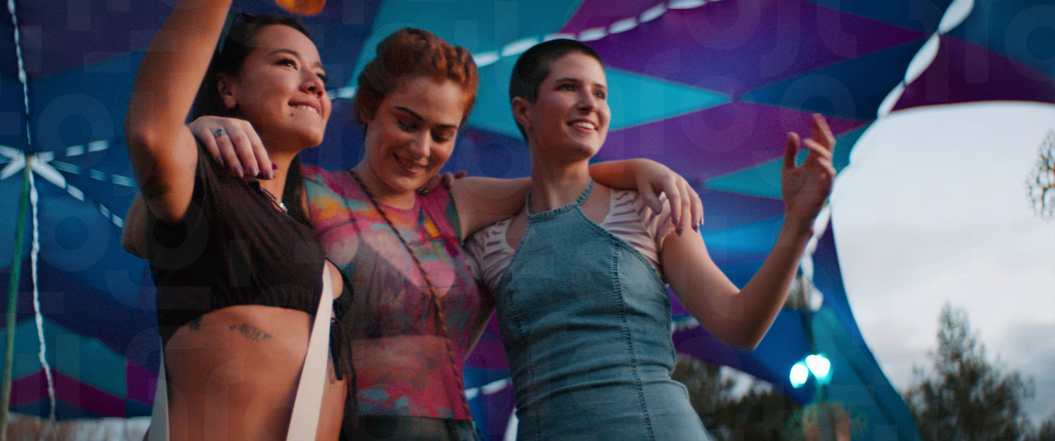 Three friends are embracing while laughing and dancing at an outdoor music festival. Captured using an anamorphic lens and presented in the 2.39:1 CinemaScope aspect ratio.