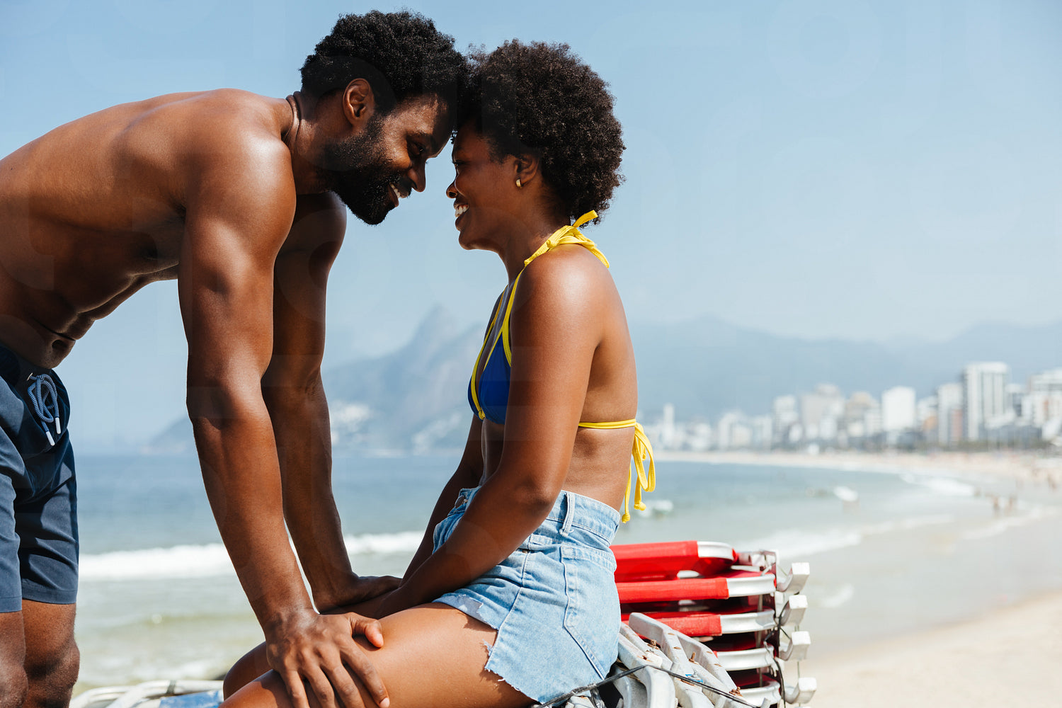 An affectionate couple is seen enjoying a sunny day on a beach in Rio de Janeiro. They are smiling and sharing a tender moment by the ocean, creating a romantic and joyful atmosphere.
