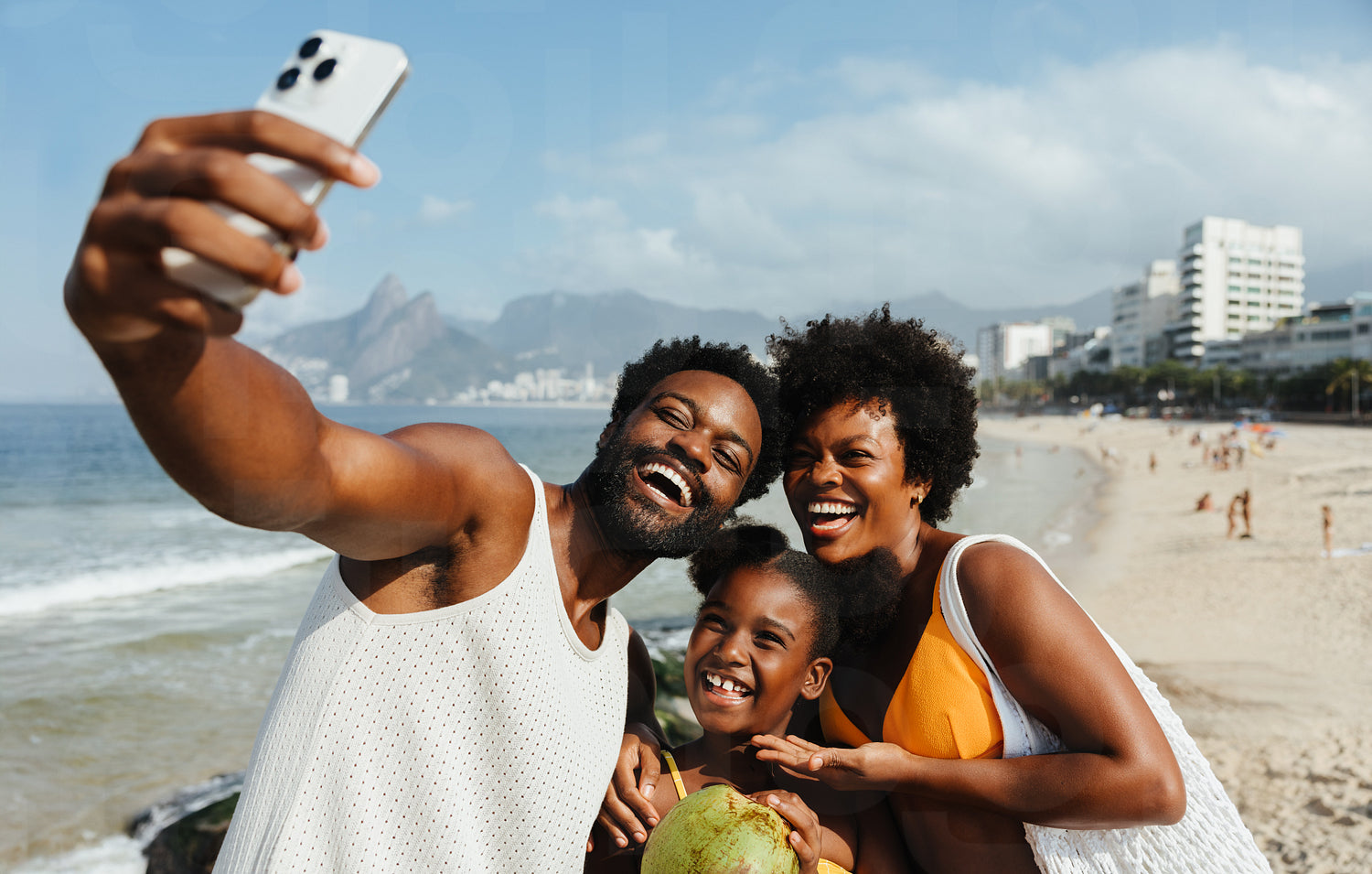 A cheerful Brazilian family enjoys a sunny day at a beach in Rio de Janeiro, capturing the moment with a selfie. The scene showcases joy and togetherness, with the iconic cityscape in the background.