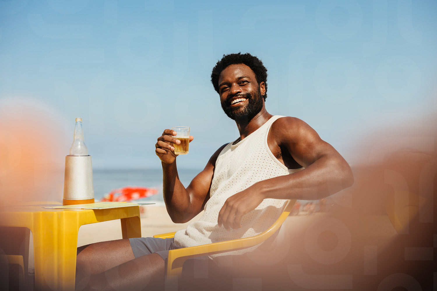 A smiling man relaxes at the beach, enjoying a refreshing drink under the bright summer sun. He exudes a carefree and joyful demeanor, embracing the essence of a perfect vacation day.