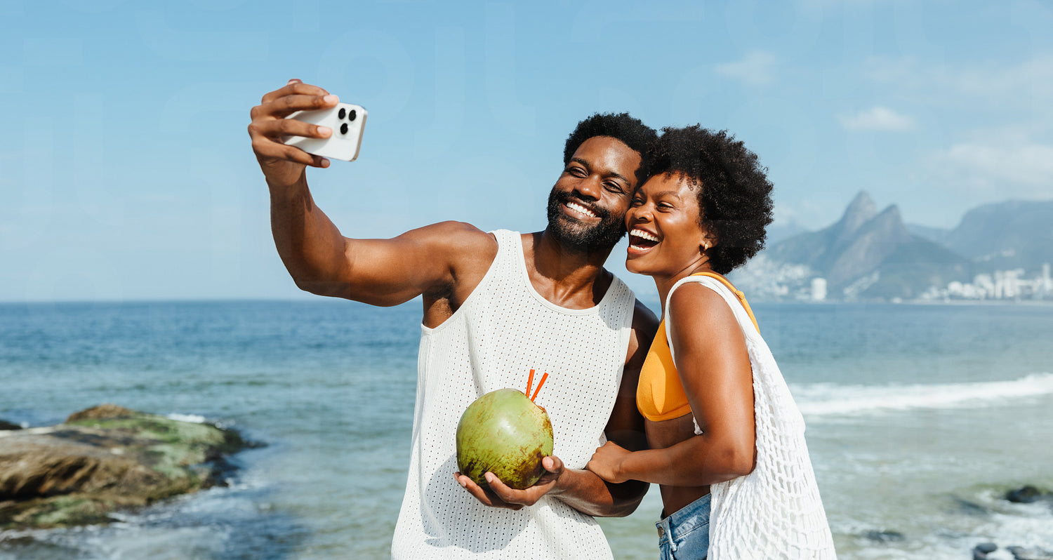 A joyful couple on their honeymoon captures a selfie at the beach in Rio de Janeiro. The scene is set against a backdrop of blue waters and sunny skies. Happiness, love, and leisure travel moments.