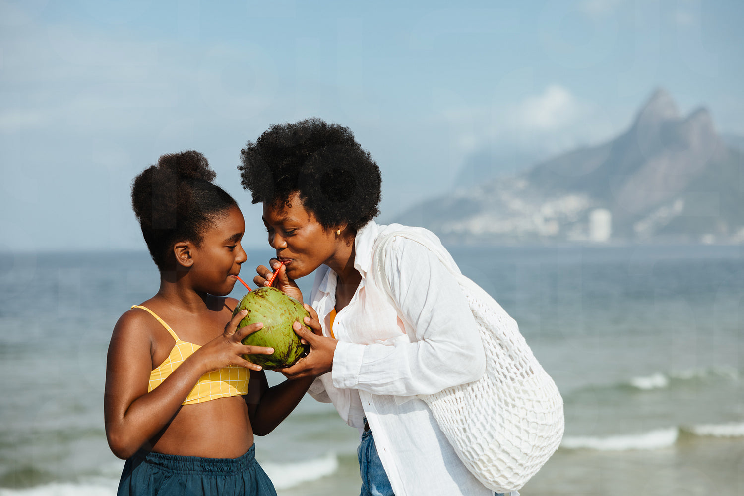 Mother and daughter drinking coconut water on Rio de Janeiro beach
