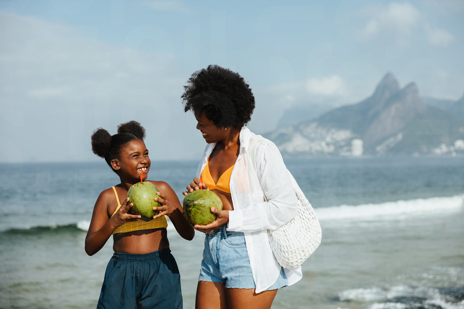 Mother and daughter enjoying coconuts on Ipanema Beach